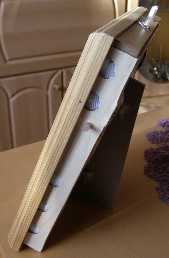 В обоих боковых стенках "коронками" по дереву просверлены по 5 отверстий для вентиляции: сначала диаметром 20мм, а потом с внутренней стороны до половины толщины 25мм - это ещё в разобранном виде. Потом туда вставлены сеточки из фильтров для кухонной кружки для фильтрования воды.