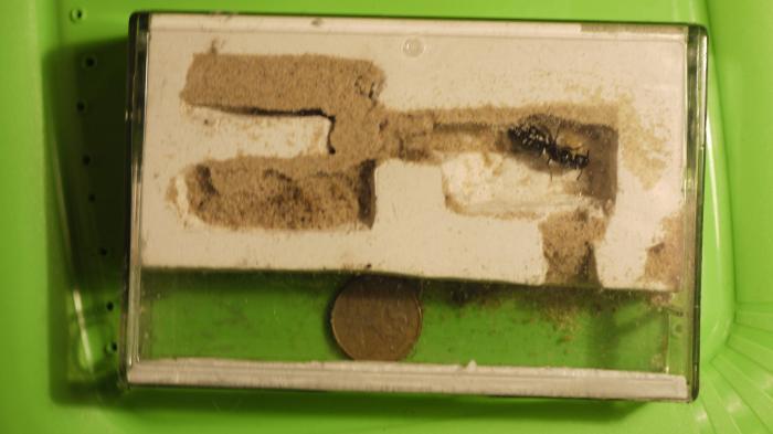 Летом, где то в середине июля удалось поймать матку Camponotus vagus . С начала она была посажена в пробирку но т.к. она маленькая ( нет возможности достать большую ) матка даже не откладывалась, ей видимо неудобно было даже разворачиваться. было решено подключить форм который ранее использовался для нигеров, только не вертикально а горизонтально. Матка тут же перебралась туда, и к 20 м числам августа появился первый рабочий, но по каким то причинам он был убит и съеден. Далее никаких изменений замечено небыло.