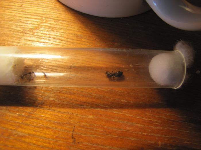 Дело в том что пробирки, в которых живут мои нигеры были в плохом состоянии (плесень из-за не доеденых сверчков, черная вата, странного цвета вода за ватой, и воды было мало к тому же + не удобно чистить), и я решил попробовать их переселить, соединил две пробирки, щели заткнул ватой, ту, в который они жили поставил под наклоном, сверху поставил настольную лампу, ну а вторую пробирку я затемнил соответственно. Лег ночью спать, проснулся посреди ночи глянуть, а они уже перенесли приплод, и матка была уже во второй пробирке. Отсоединять не стал, т.к. был еще один муравей в старой пробирке, вдруг еще не все перенесли, и лег дальше спать. Утром проснулся, всем составом сидели уже в новой пробирке.