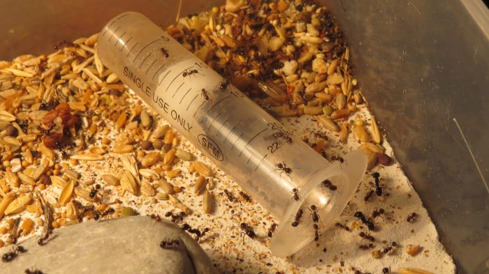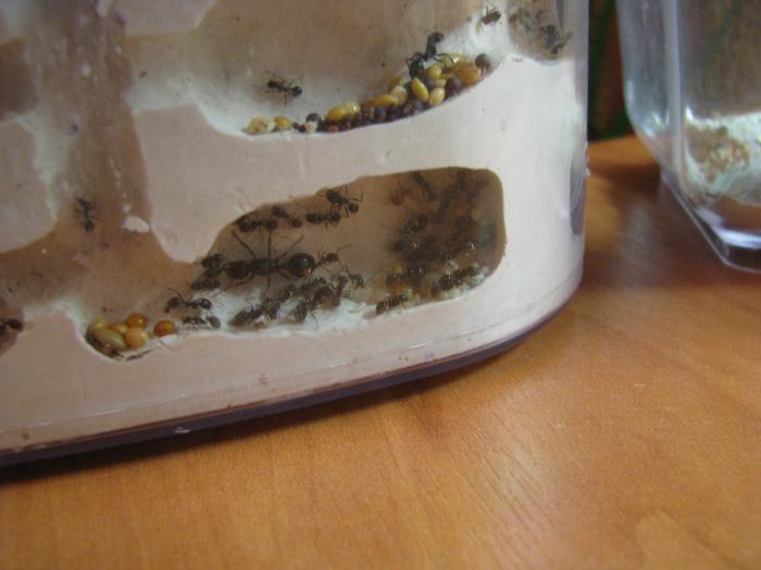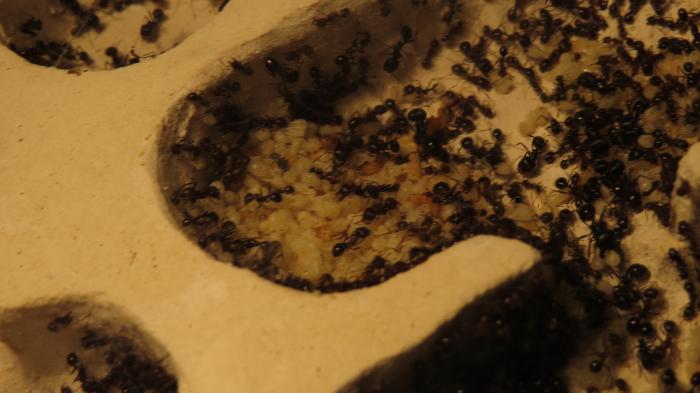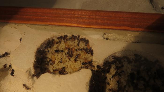 Заселил недавно в 7 - ми камерный форм, сделал арену, сдерживаю от побегов губной помадой. На данный момент около 60 - 70 рабочих. В отличие от дентов, структоры так заполнили зерном камеры, что сверху они там хранилище устроили ( там где сетка, крышка форма ). До сих пор таскают.