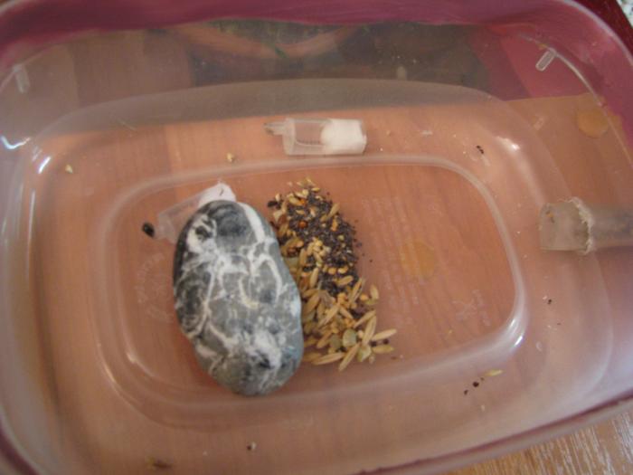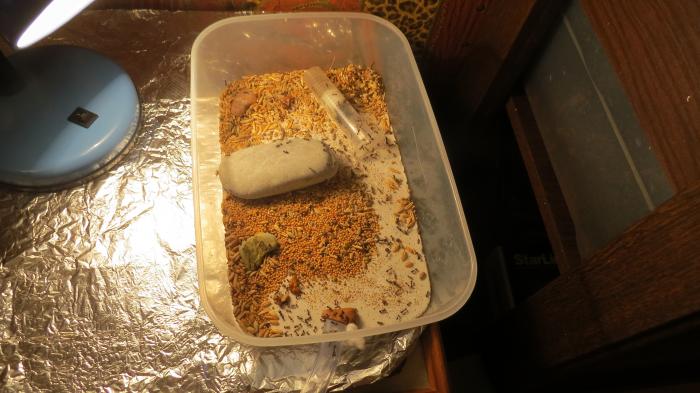 Корм: смесь для канареек Чика, Брава для волнистых попугаев, тыквенные семечки, мак, мраморные и туркменистанские тараканы, зофобасы ( игнорируют ) бананановые сверчки ( редко ) моль.