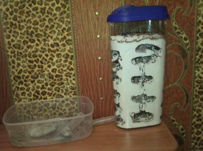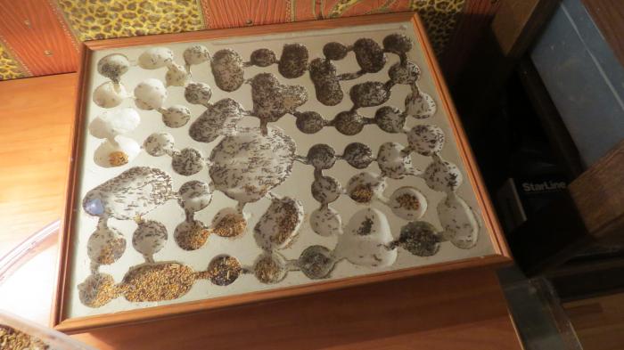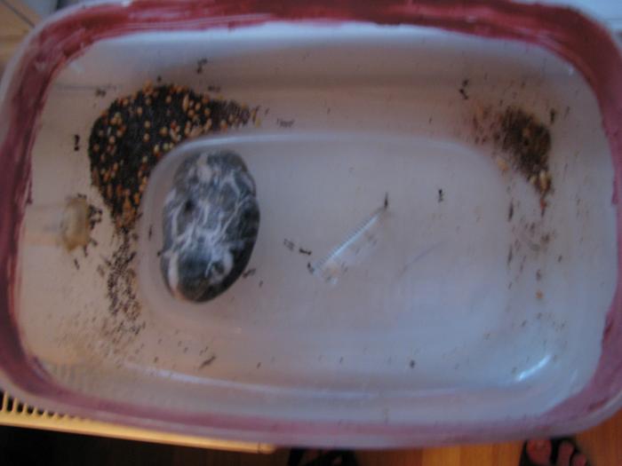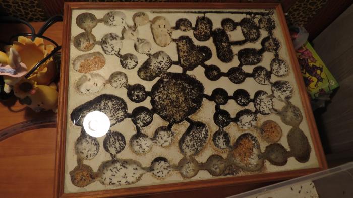 дурдоме)). Извините что давно не обновлял блоги, так как 9 класс закончил ( сдал ГИА ) и вот избавился от лени после учёбы и решил обновить блоги. Вот и структоры, их уже наверное 3500 рабочих. 30 - ти литровый аквариум nicksqr ( Николай ) сделать не смог, время не было. Пришлось думать, что делать, самому большой форм делать не хочется. И вот спасибо Boris Mokrov сделал мне форм ( огромное спасибо ), из 53 - рёх камер из фоторамки размером 40Х50. Потом в мае он его мне отдал, а потом 9 мая мы улетели всей семьёй в Турцию, естественно, переселять не стал ( вдруг дома разбегутся? или коты смахнут? бабушка с мурахами в таком случае не справится, если и да, то как она говорит кипятком всех))) ) Вернулся я 19 мая ( 11 дней был ) ну и начал переселять в тот же вечер, как и прилетел, подсоединил шланг из форма в форм, без всяких светов, подогревов переселились сами за 5 дней. На следующий день уже ушла половина рабочих и матка с половиной расплода. Потом ночью и зёрна перетащили, и потом через 4 дня переселились полностью, старый форм выкинул ( он страшный был, посмотрите предыдущую запись ), но в нём осталось где - то 50 рабочих, я их экзаустером на арену вернул. Арену поменял на контейнер 3,5 литра, залил дно гипсом, сверху песком с ракушками из Азовского моря. И вот теперь половину камер зернохранилищем сделали. Пошли крупные солдаты, едят всё!) и мучняков, и тараканов. Но я потом заметил, что они стали 3 камеры превращать в мусорные. Щас стали выносить ( конечно, а где зерно дальше хранить? лучше выкинем на арену, а зёрна на место занесём ). Вот я перестарался от радости насыпал кучу им всяких зёрен, половину не тащат. Ну ничего, нужно будет - затащат в гнездо. Свечу арену с утра до вечера лампой, ради дополнительного декора поставил камушки с Крыма и Турции ( большой с Турции ). Формикарий приходится закрывать 2 - мя листами фольги, свет безумно боятся. Муравьи много пьют воды, как видите на фотках, уже половину 20 - ти миллиграмового шприца выпили. В среднем, его им хватает на 2 недели. Живут в этом формикарии с 24 мая ( 19 подключил ), и не РАЗУ не пытались его грызть, и не пытаются. Гипс сам открытый, стекло приклеено герметиком ( чтобы не пытались просочится ). Вентиляция сделана сбоку в гипсе ( просверлены дырки ) и там на герметике держатся сетки. 6 вентиляционных отверстий. Думаю я всё рассказал о них и их домедурдоме)).Кстати, структоры лучше дентов на данный момент развиваются.