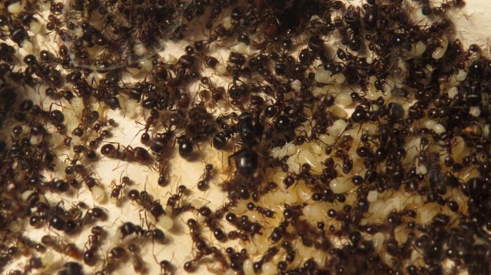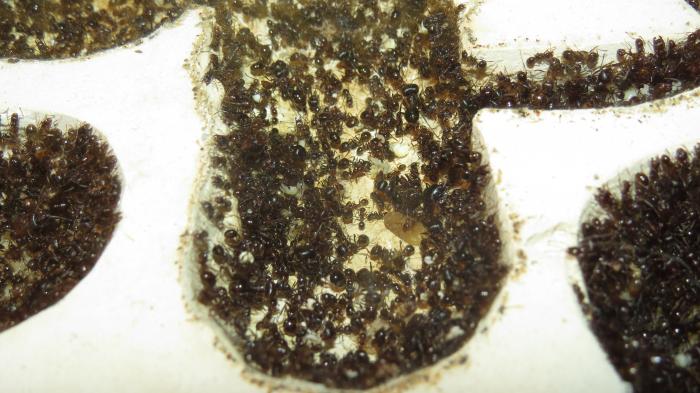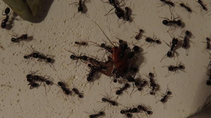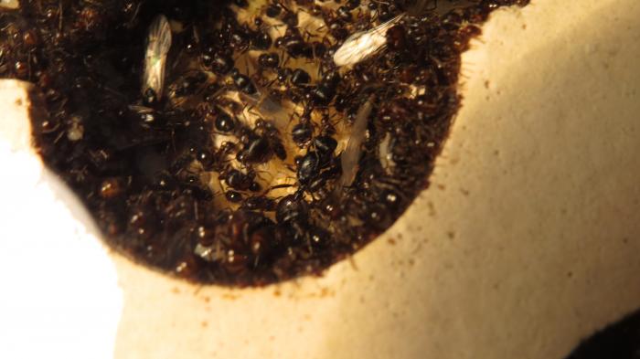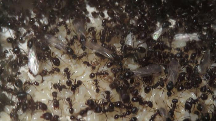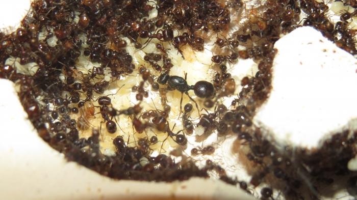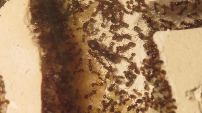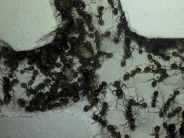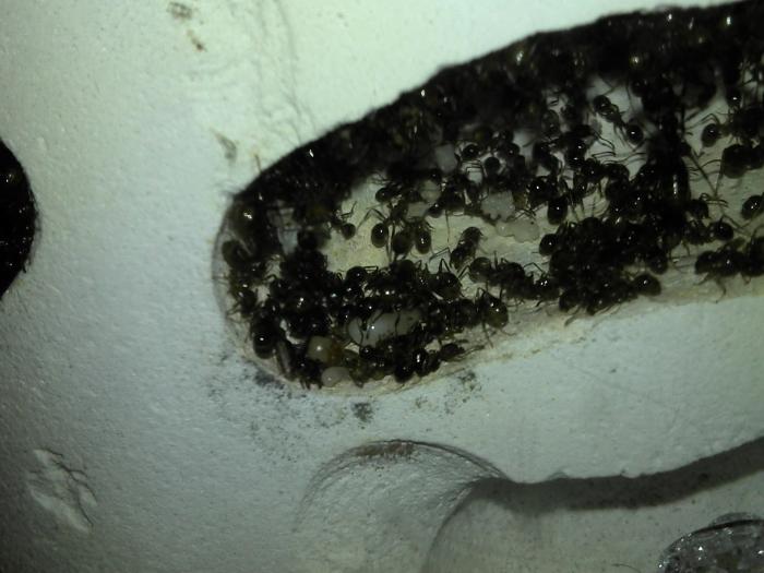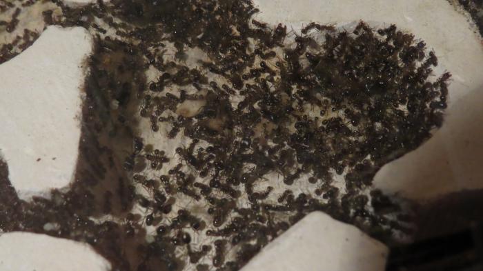 Структоров ОЧЕНЬ много, население примерно в 5000 - 6000 рабочих, крылатых не выводили, куча больших солдат. Едят по 20 тараканов, пробирку с водой выпивают за 2 дня. Не так давно, 20 октября 2013 года улетел в Турцию на 11 дней, оставив бабушке только аренариусов, структоров, барбарусов. Короче, 26 октября, бабушка звонит в Турцию мне и говорит, что структоры разбежались. Она дырку не нашла, перед отъездом, они прогрызли дырку в камеру увлажнения. Я закрыл ваткой это дело, и видать, кусок ватки маленький был, и они через 6 дней устроили побег. Бабушка заклеила скотчем по бокам рамку и они перестали бежать. Тыщи 3 я потерял, матка на месте. Бабушка кого могла собрала, а приехав, нашёл их в горшке с алоэ. Штук 1000. Представьте, как мне было хреново в тот день, когда я в другой стране, комната как она говорила была черным черно. Жертв от них не было, в комнате была в некоторых местах земля, пыли и прочий мусор. В районе горшка с алоэ, вокруг горшка на полу была насыпь как в природе, поднимаю а под горшком кишмя кишит ими, так собирал каждого 3 дня. Увлажняю раз в месяц их. В шлаге сидят, так как я лапму рядом с ними включил, они и перебрались в шланг на время. Больше волновался за дентов и барбарусов, но они не пострадали. В комнате, в паутине у домашних пауков полно трупов структоров весит, это видать те, которым не повезло. Сейчас думаю, куда деть структоров, так как не представляю ещё такие же 2 - 3 рамки с ними, вот и история.