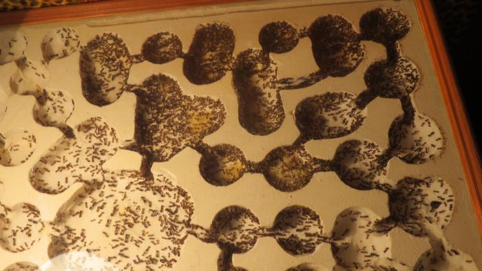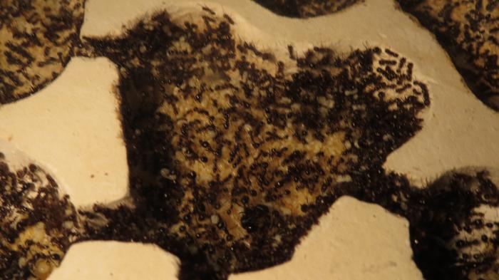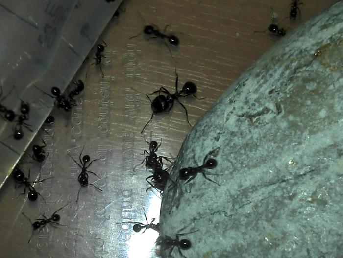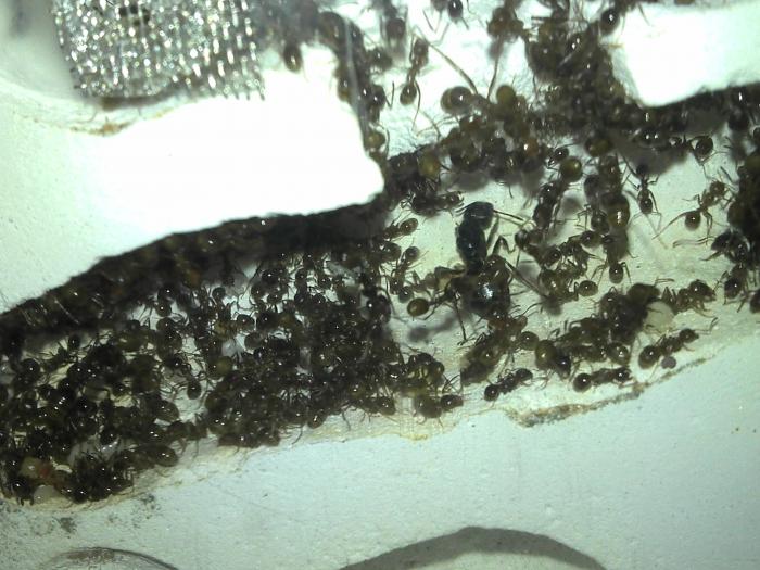 Переселил их я где - то в начале декабря, уже пора опять переселять, заказал им 30 литровый аквас у nicksqr ( Николая ). Будет наверно к апрелю, маю готов. Обидно, что этот формик им я плохо в этот раз сделал ( разбился верх, когда плиту вытаскивал ), сверху ( там где разбил, устроили кладовку). У них сейчас 22 камеры, но плотность населения вообще кошмар! Не так давно, предложил им пыльцу, едят на ура! Вообщем, всеядные ребята. Вот пара фоток, сделал телефоном.