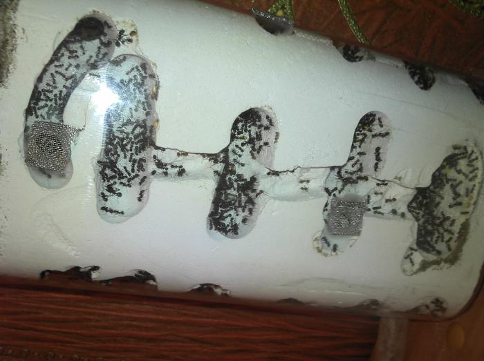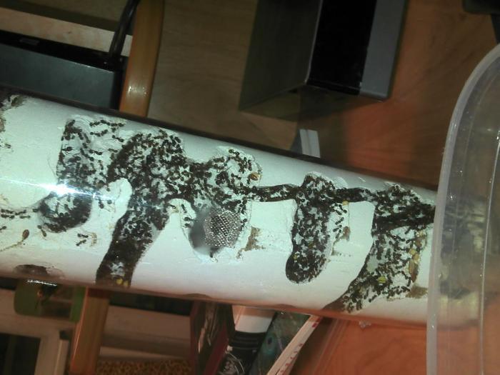 Вот так мы выросли)), сейчас в семье порядка 200 рабочих, сделал 12 - ти камерный форм, в начале июля переселю, тут им негде хранить зерно, расплод, все уже на верху сидят ( там где припаяна сетка ), там и зернохранилище, и расплодная. Едят много. Расплоду им деть некуда! Они его хранят в переходном шланге.