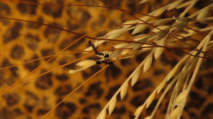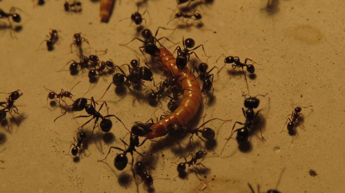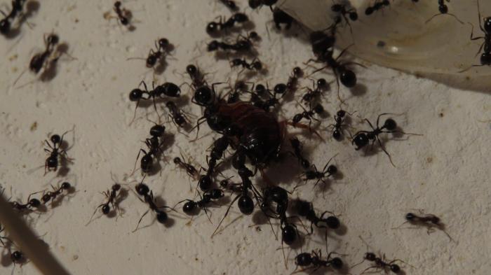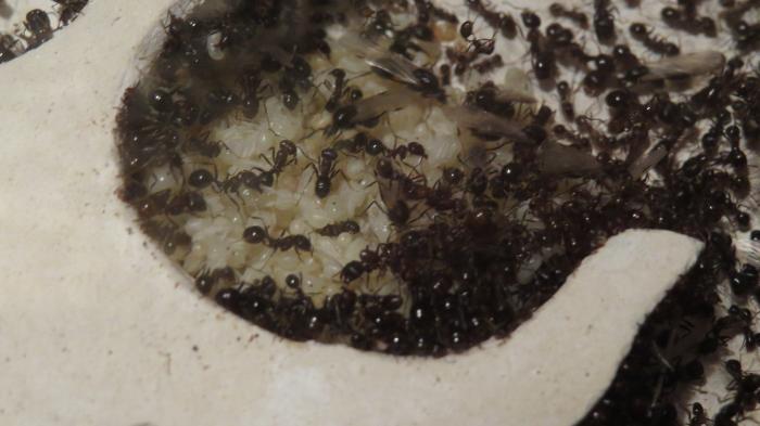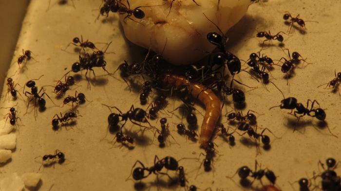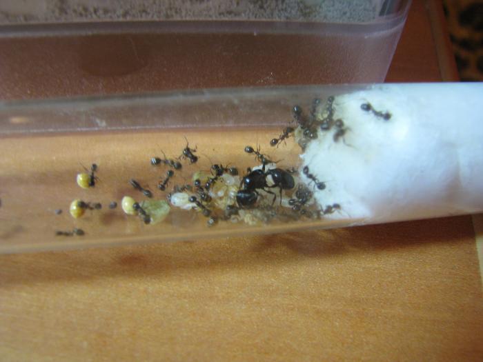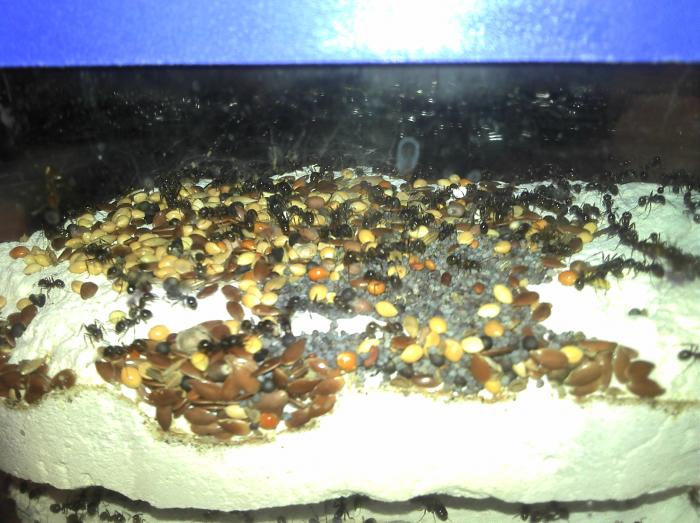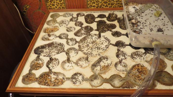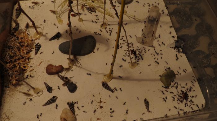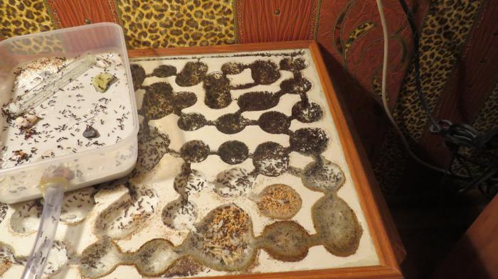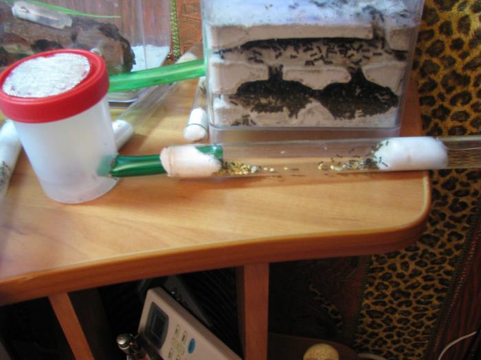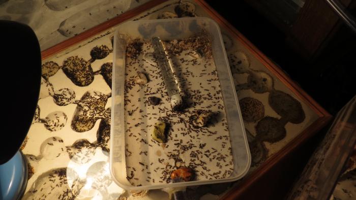 Удивляюсь, как жнецы быстро растут. Камер 5 просто забито расплодом. Стараюсь практически не давать им белок, так как они просто быстро от него растут, пусть семена все съедают. Позавчера под ареной с фонариком на телефоне ночью смотрел самку лупой. Застал момент, как она кладёт яйца, целый пакет отложила, жаль, что под рукой не было фотоаппарата. Как видите, личинок мучного хруща за милую душу едят, сейчас пиши и вижу, что они их уже в муравейник по шлангу тащать, а не прошло и 5 минут, как я их сфотографировал. Численность семьи думаю не менее 7000, крылатых самок и самцов вообще ни разу не видел и не вижу среди расплода. А зачем они в формикарии? толку не будет, только как рабочие. Нисколько не жалею, что завёл наших жнецов. Не так давно купил камушки для аквариумов, промыл, и немного сыпанул жнецам. Так они их выбросили), я рассчитывал их видеть как декорацию, а они их все собрали и в угол на помойку. Сам формикарий я переставил на тумбочку которая стоит под телевизором, на место жнецов поставил формикарий с феллахами.