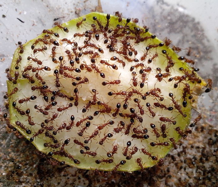 4. Полностью выгрызают тарика на арене, не занося мусор в пробирку. Я еще не видел, чтобы муравьи так тщательно выгрызали хитин. Он так "вылизан" изнутри, что просвечивается (даю имаго банановых тараканов).