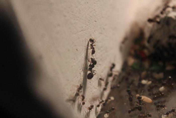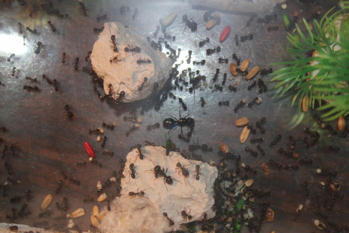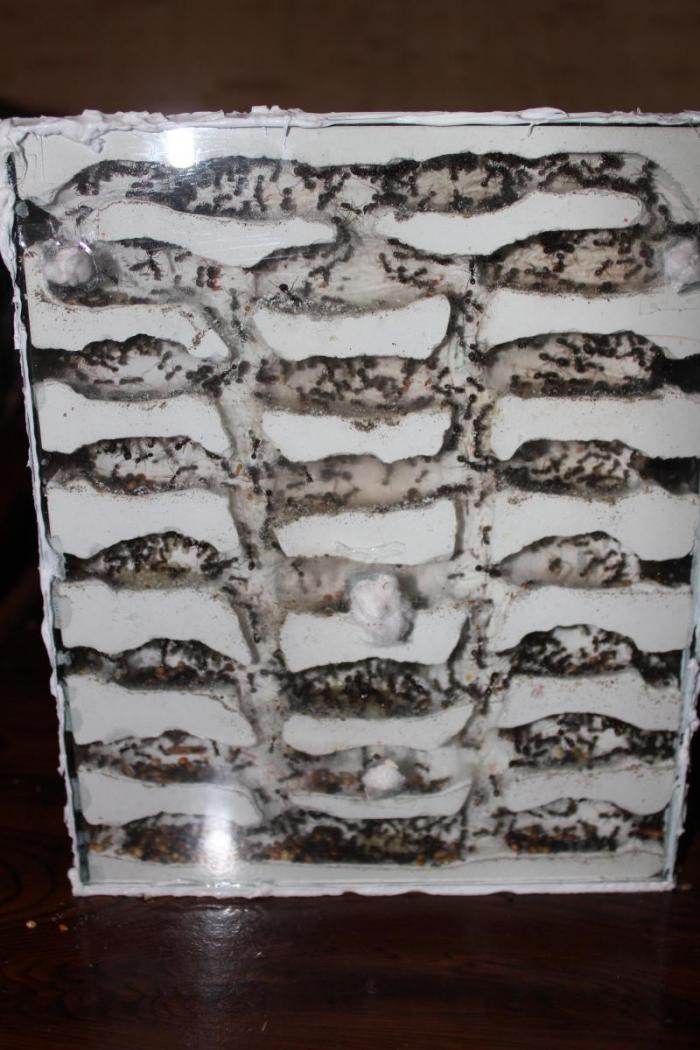 С тех пор минуло множество дней и месяцев. Колония росла, численность перевалила за 1000 особей. И, как всегда бывает, муравьи переселились в новый большой формикарий. Делал я его до неприличия долго. Но работы по его постройке завершились, примерно, еще к концу января 2013 года. Мурахи переселялись (февраль) пять дней: С 4-ого по 5-ое число я муравьев не тревожил, они исследовали формикарий и осматривали его окраины. 6-ого числа я затемнил новый дом, но старый пока не освещал, так же приступил подавать еду уже в другой формикарий. Увлажнил новый и не увлажнил старый. Ночью с 6-ого по 7-ое февраля муравьи перенесли большую часть расплода в новые хоромы. Но к полудню 7-ого числа муравьи оставили наоборот: в новом меньшее число детенышей, а в старом большее. Поэтому именно в этот день я поставил лампу, то есть осветил старый дом. Матка еле-еле перешла, а с ней и вся колония. На старой арене и формикарии остались еще муравьи, но я их отсоединил и оставшихся согнал, воссоединив с семьей. Жаль, но крылатую матку убили вскоре после переселения, наверное, в суматохе. Фотография переселения прилагаются.