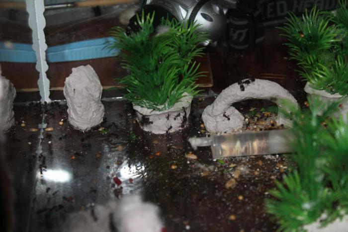 По всему формикарию разбросан песочек. Больше никогда не буду украшать арену мелким песком. Формикарий с песком - не самая красивая картина, хотя это видно на фотографиях)