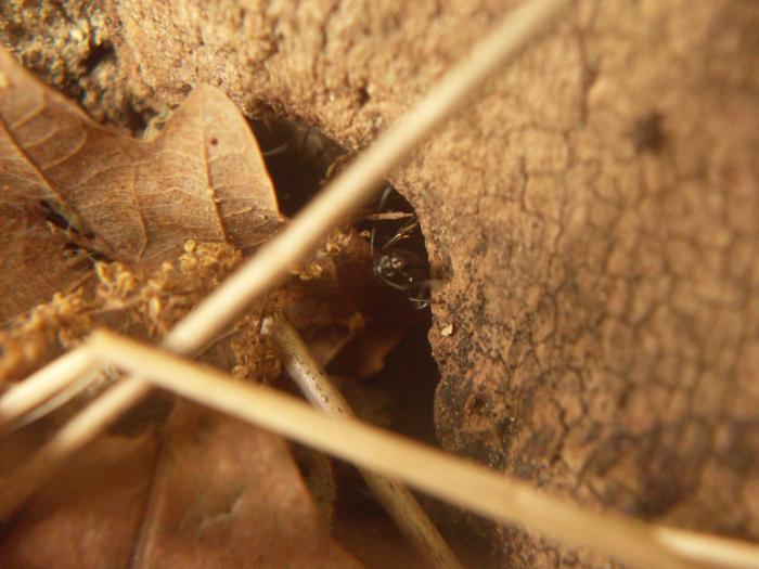 4. Обнаружил нечто весьма интересное, а именно упавшее дерево, довольно старое. При поднятии коры заметил море расплода формики и тучи рабочих. Через пол метра снова приподнял кору и заметил ту же картину, только с тетрами. Две семьи живут рядом, причём чередуясь, то есть расположены по всему дереву, а не на двух половинах. Семьи огромны, поэтому, наверно, каждая их них жива и здорова.