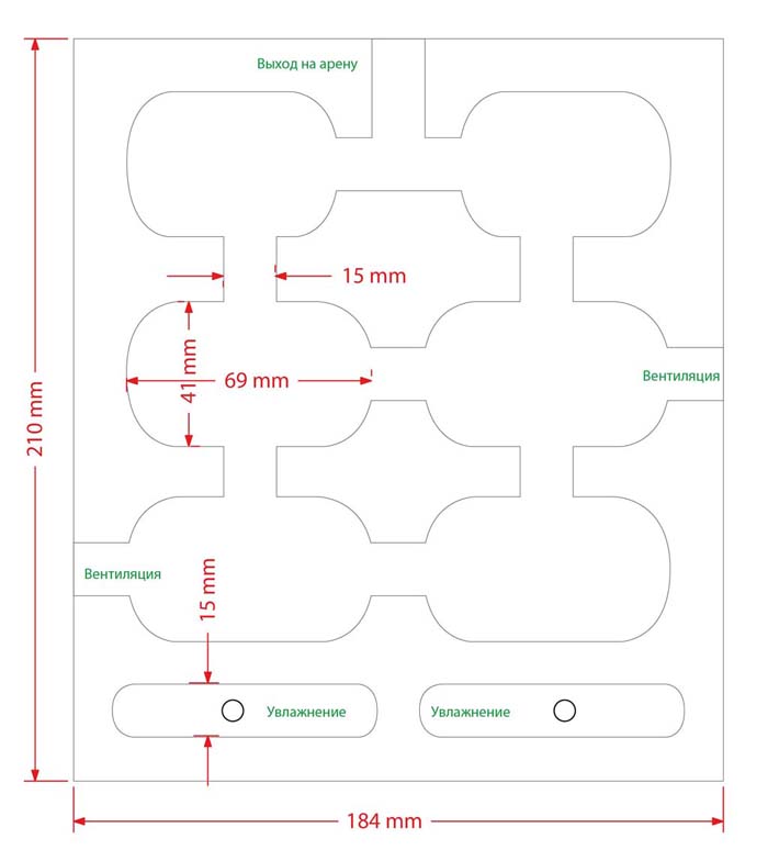 Два отверстия вентиляции считаю нецелесообразными. слишком много на маленький форм. достаточно оставить одно отверстие возле камеры увлажнения, выход на арену послужит вторым отверстием для вентиляции. При вашей системе ходов между камерами все будут всегда снабжены свежим воздухом.