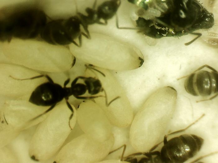 Надеюсь Михаил не сильно против, ибо я отпишусь о состоянии колонии подаренных мне им фулигинозусов прямо в этом блоге. Из первого потока коконов выжило около 5-7 рабочих, сейчас коконов намного больше, жду массового вылупления муравьев. Едят очень хорошо, обожают грушу и мед, но не отказываются и от мясной пищи. Родные рабочие сидят вместе в одной камере, один самый смелый фулигинозус фуражирует наравне с нигерами, которые иногда покусывают его за ноги и тянут обратно домой.