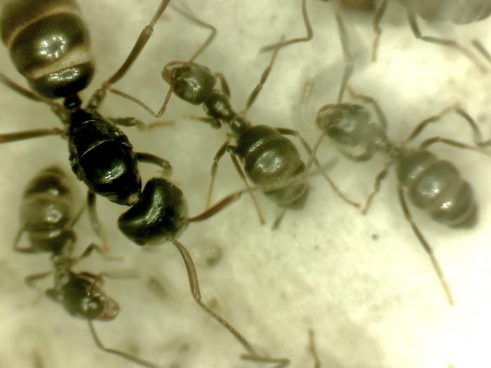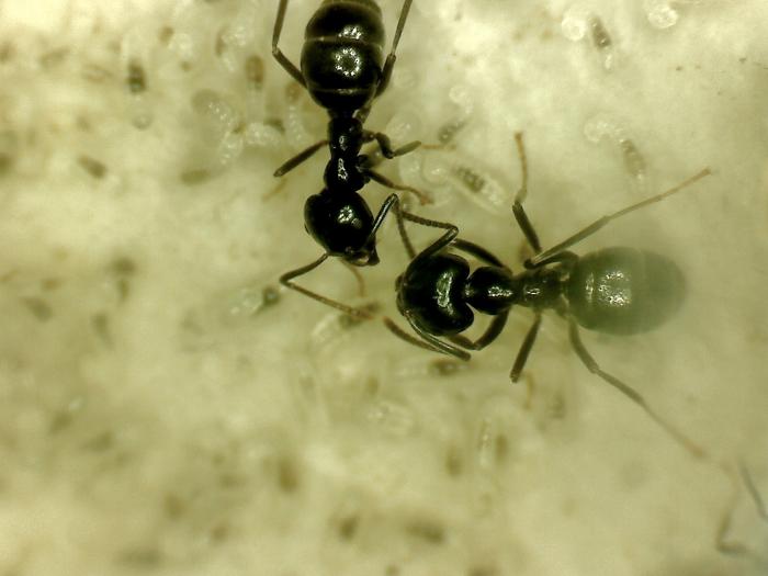 Вот к ним и попробовал вчера подсадить пойманную матку Lasius fuliginosus. Выпустил её на арену и через полсекунды в неё вцепился один из нигеров. В общем, картина была удручающая: матка носится по арене, как ошалелая, каждый встречный норовит её цапнуть, на лапе болтается вцепившийся нигер. Меня хватило секунд на тридцать... Короче говоря, удалось мне выудить её с арены и посадить обратно в пробирку с влажной ваткой. Агрессора удалось от неё отцепить.
