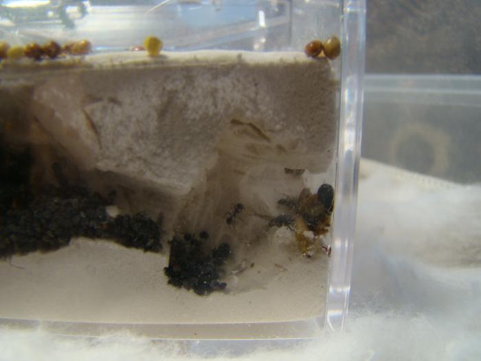 Я бы делал отдельно арену, отдельно формикарий. Арену бы держал всегда сухой. В формикарии постарался бы сделать больше камер и создать градиент влажности. Чтобы муравьи могли выбирать, в какой камере хранить зерно, где его сушить, где куколок держать, а где -- личинок.