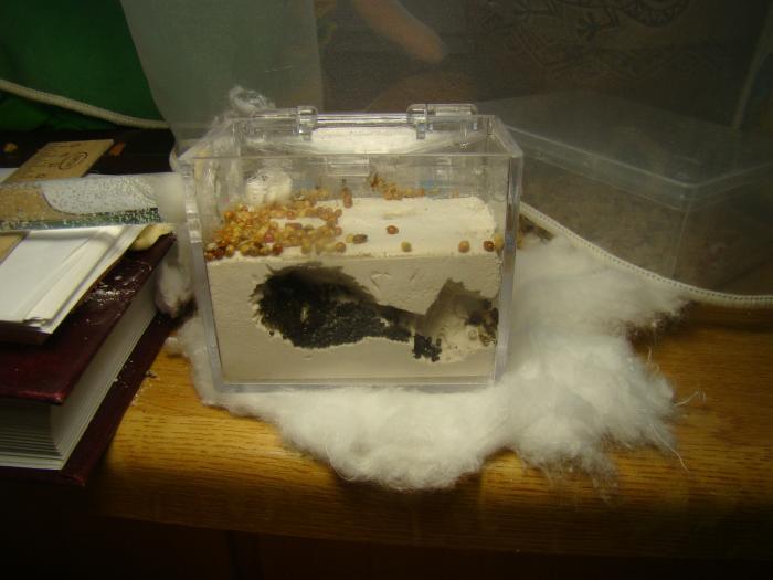 Лично мне не нравится такой формикарий. Нормальной влажности здесь не сделать. Либо будет совсем сухо, либо сыро и зерно начнёт прорастать и плесневеть. Поилка приляпанная к арене - ерунда. Для формицин ещё сгодится, но не для мессоров. Мессоры не щибко воду переносят. От жажды может и не умрут, но увлажнять формикарий и приплод не смогут. Что-то мне кажется, скоро будет попытка №3...