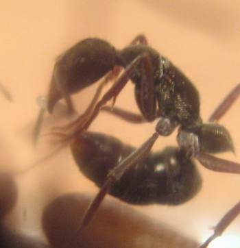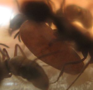 Вчера практически с самого начала наблюдал распаковку нового муравья, и все бы ничего, но заглянув в пробирку где-то через час обнаружил у нескольких диакамм в жвалах комочки очень похожие на то, что остались от ранее съеденного. К сожалению, свежий муравей практически не отличается от остальных, ноги только чуть светлее, так что теперь меня гложут сомнения - а не съедались ли все новые муравьи? Тем более, те что я заметил были меньше остальных, а в колонии я таких сейчас не наблюдаю.
