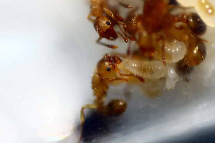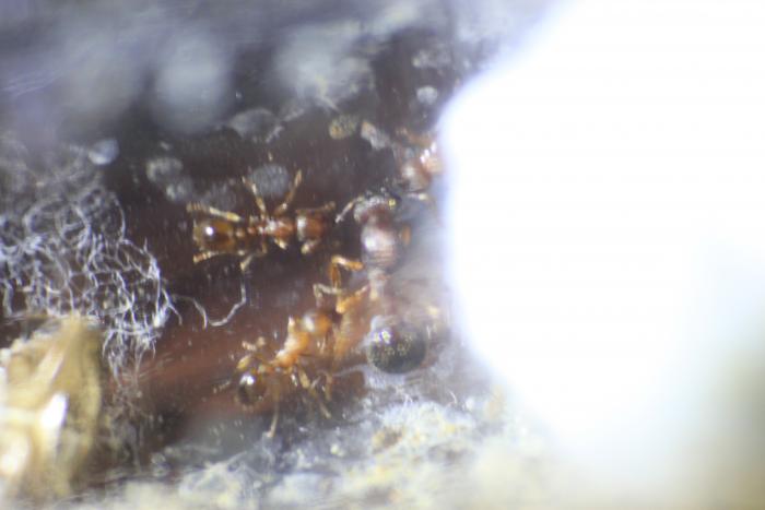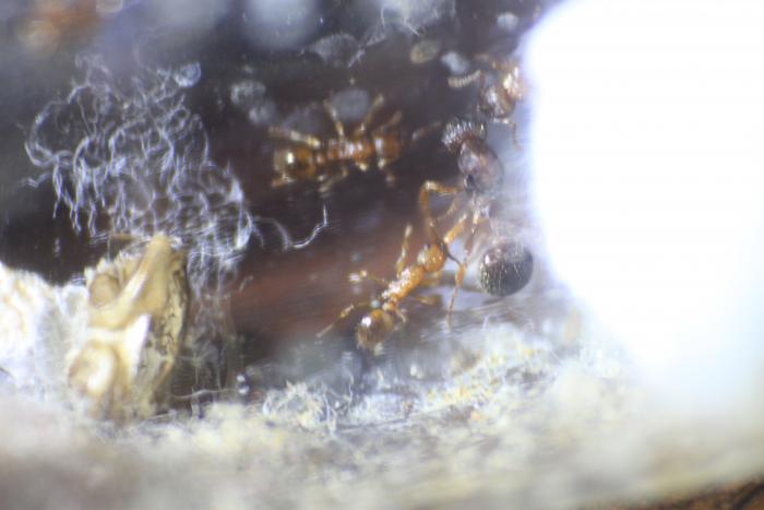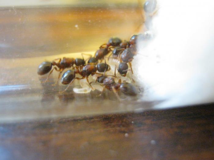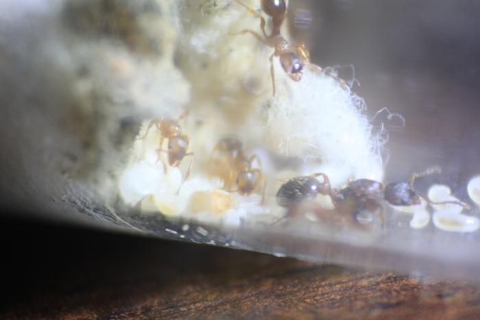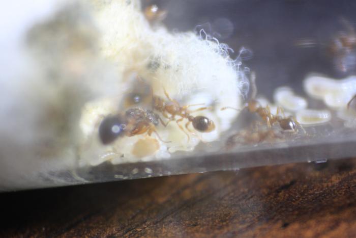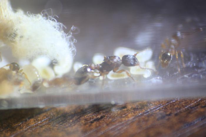 Подкармливал редковато, давал мед, сироп, кусочки винограда, курицу, дрозофил и ниточки сырого мяса. Все ели с удовольствием. 3 семьи быстро отложили яйца, причем первыми откладывали семьи с наименьшим кол-вом маток. Самая большая семья из 9-ти особей разродилась последней и у нее на данный момент только личинки, семья из 6 маток лидирует с личинками и 2 имаго.