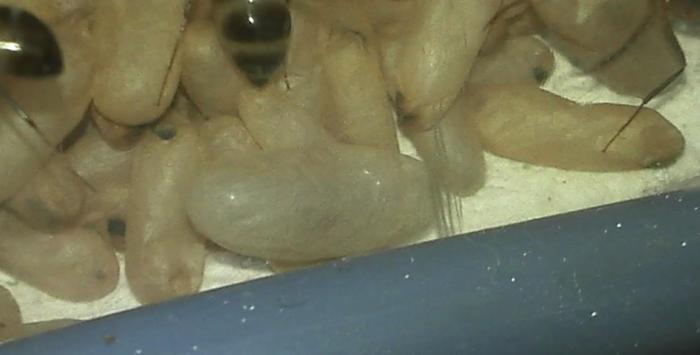 Сколько времени я держу муравьёв, никогда не видел извивающихся личинок. Единственные подвижные личинки я видел только у одонтопонеры и сервиформики фуски, как ни странно. Остальные двигались только немного, если их задевал кто-то из муравьёв. Хотя тут возможен другой вариант, что железы находятся не только во рту, но и на поверхности тела. Но это было бы немного странно. И опять таки, на фото не видно нитей, это больше похоже на корку, как эпидермис. Если бы это были нити, то кокон бы рвался поперёк своей длинны, а не хаотично, как на фото.