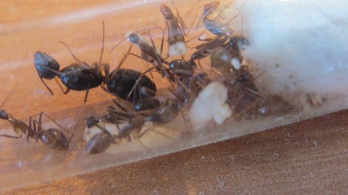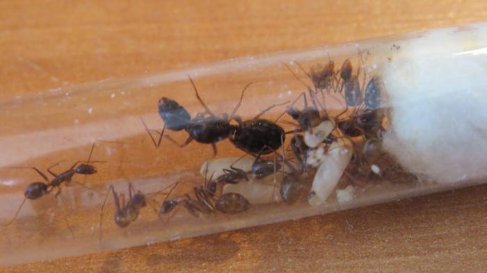 Население: 14 рабочих, самка, 4 кокона и полно личинок. Живут в пробирке.