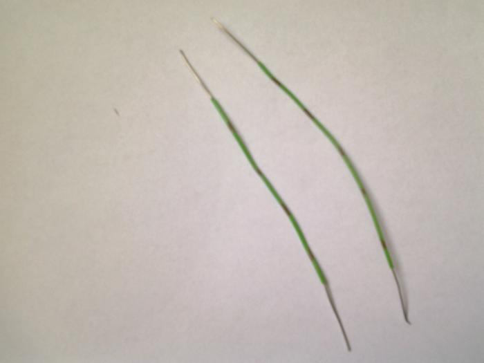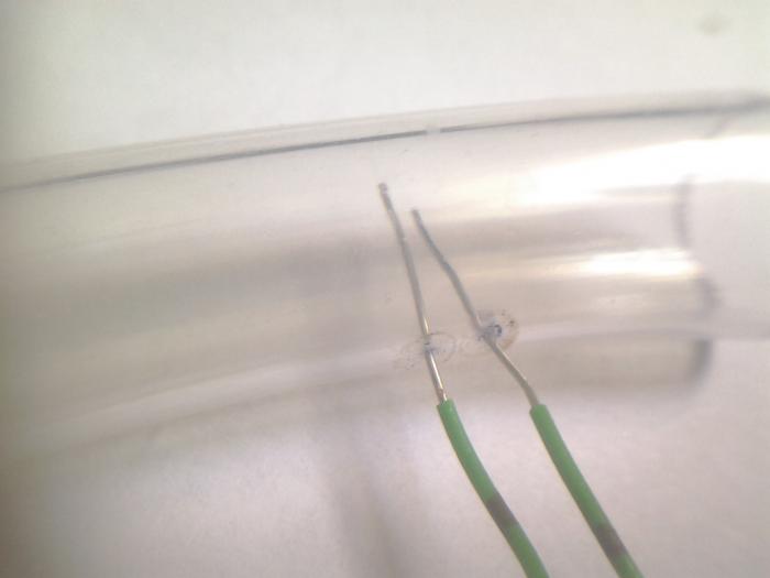 Теперь зачистим контакты на проводах, до этого поделив их на 2 равные части. В трубке делаем две дырочки на расстоянии в 1 - 1.5 мм. Чем меньше, тем чувствительнее "прибор")