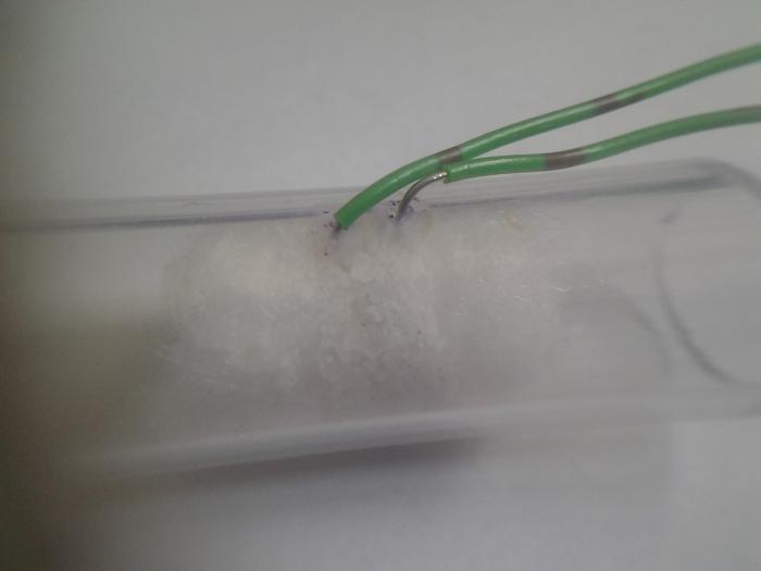 Я высунул ватку и соль, после нескольких испытаний и увидел, что соль слоем осела на стенках. Теперь можно было не использовать ватку и кучу соли. Тоненький слой соли обеспечивал нужную проводимость при влаге. А самое главное - результат менялся быстро и без ложных показаний!