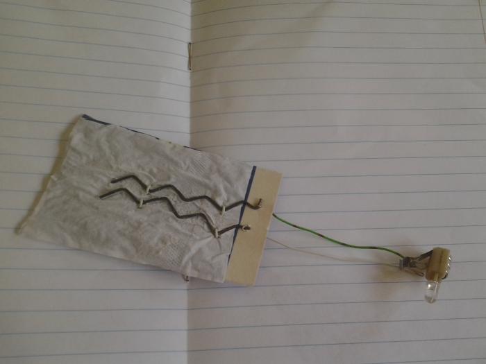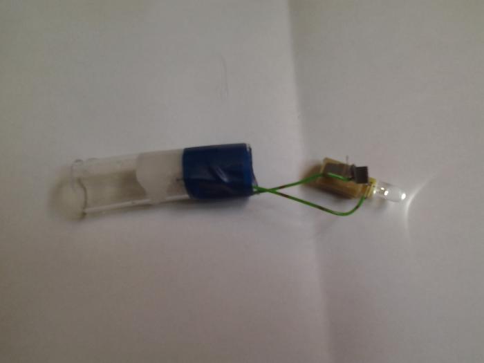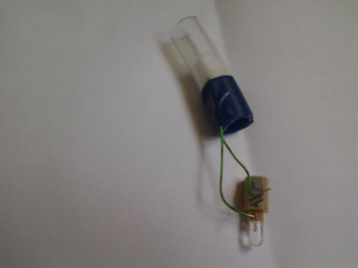 Кстати, нам еще потребуется изо-лента или скотч. Я взял изо-ленту. Крепим провода к трубке, дабы они не шатались. Ну и теперь крепим лампочку. Такой светодиод можно достать из зажигалки, в магазине посмотрите, там светодиодик есть.