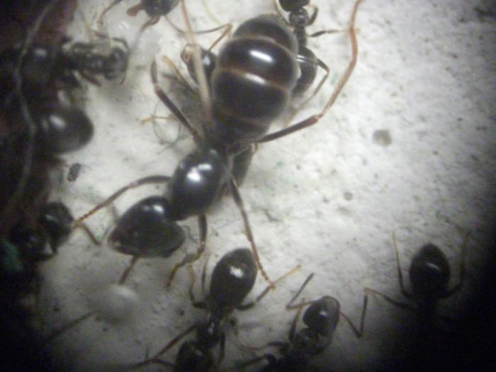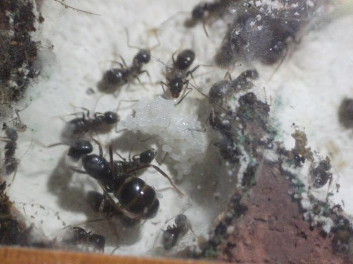 Муравейники Lasius fuliginosus есть и у нас, но мне ни разу не удавалось увидеть и поймать матку после роения. Огромное спасибо Михаилу (likeman), который обещал помочь в этом вопросе. И вот пришла ко мне по почте матка этих замечательных муравьев c несколькими десятками рабочих и куколок Lasius niger, В качестве временного жилища был предложен небольшой гипсовый формикарий, в котором ранее жили муравьи феидоле. Переселение прошло очень быстро, в течение нескольких минут рабочие перетащили матку и куколки в новое жилище и пропали из видимости. Оказалось у феидоле были выгрызены потайные камеры по периметру, в них муравьи и спрятали матку. Это меня не устраивало, пришлось браться за гипс и делать им персональное жилище, а муравьев переселять обратно в пробирку, пока они не освоили феидольский формикарий. Через неделю прошло повторное заселение, уже в персональный формикарий с небольшой ареной. Через несколько дней из оставшихся куколок вывелись последние муравьи L. niger и я подумал об неоходимости отправить семью на зимовку, но при более тщательном осмотре камер обнаружил большой пакет яиц уже L. fuliginosus. С зимовкой решил повременить, буду наблюдать их развитие, тем более Михаил отправляет своих на зимовку в декабре. Кормлю муравьев мелким сверчком, туркменским тараканом, дрозофилой, раствором меда.