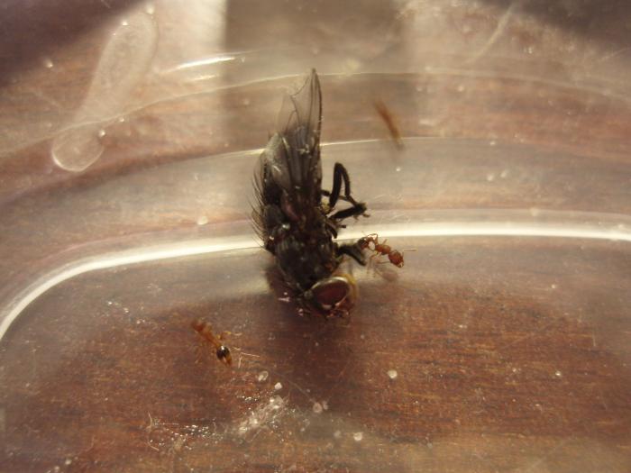 Сейчас все убрал с арены. Вымыл ее. Дал муху и яблоко.
