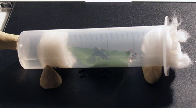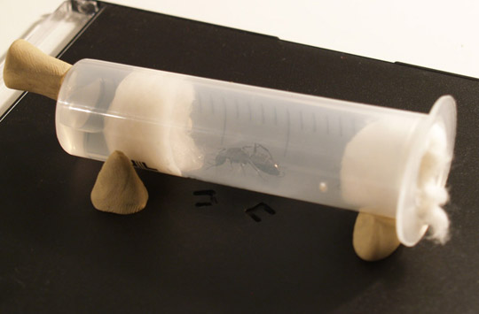 У Вас слишком "рыхлая" ватка. Поэтому она слишком влажная. На будущее -- сворачивайте ватку плотнее. Сейчас ничего не меняйте. Мокрая ватка -- не смертельно. Самка просто отнесет расплод подальше и всё. И существует вероятность залить камеру, если за ваткой будет много воды... На будущее -- лучше делать конструкцию из двух шприцов. Будет больше места. И для воды и для матки.