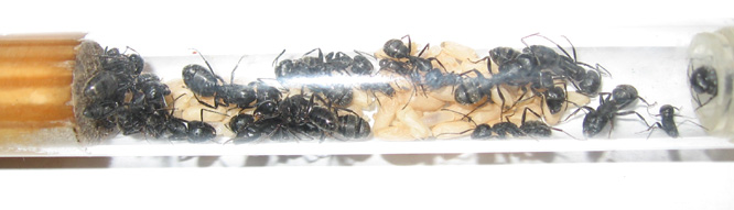 по начялу я думал что личинок они тоже приняли, я даже видел как трофолаксис между личинками и рабочими но через неделю они всех личнинок сожрали