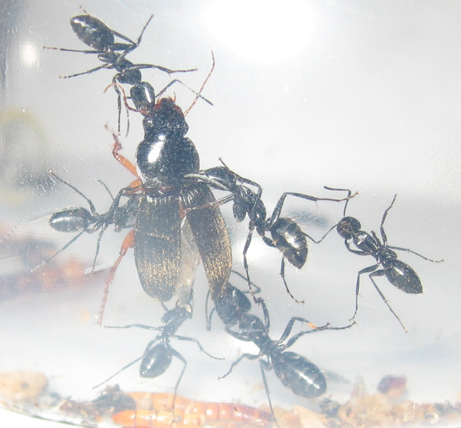 интересно что мучников (жуков и личнинок) убивают малкие рабочие, а зоофобуса грызут солдаты, можно предположить что у них есть рспределение охотников разных размеров на разную добычю:)