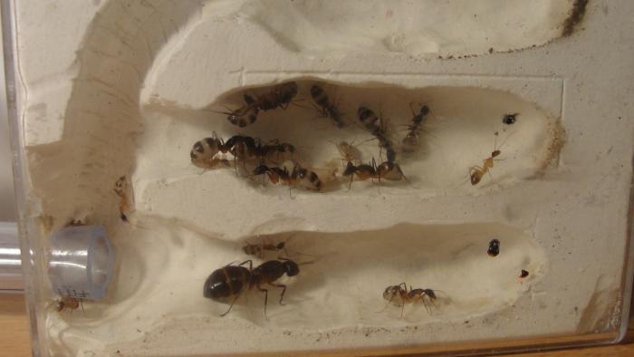 По приезде семья насчитывала 8 рабочих и матку с расплодом. Первые несколько месяцев они жили в пробирке с ареной. Со временем решил сделать мине форм из так вовремя подвернувшейся коробочки от наушников.... В этом форме они и поныне обитают))