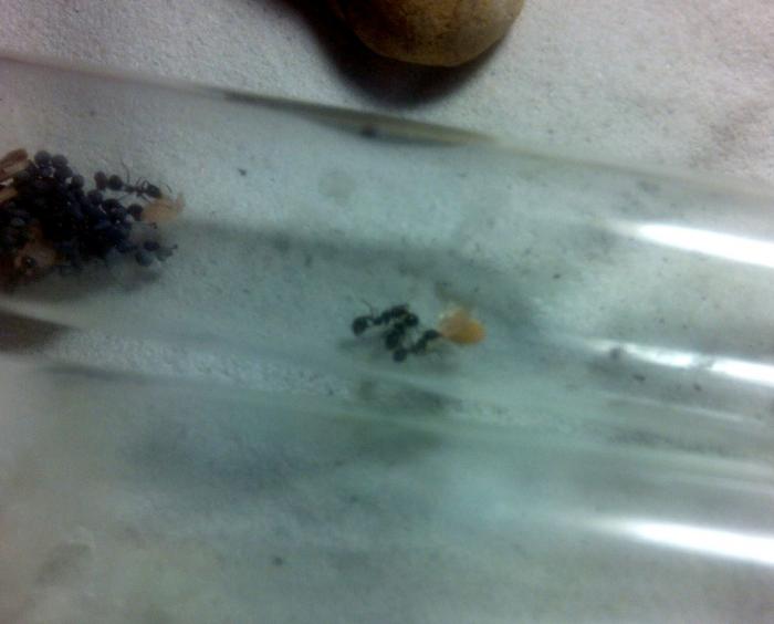 Вчера вечером внутри пробирки была обнаружена странная лужица непрозрачной желто-белой субстанции, вокруг которой сгрудились муравьи. Что это может быть? Все бы ничего, да сегодня ползя по стенке пробирки, один из мурашей свалился прямо в лужу и довольно долго пытался из неё выбраться и еще дольше отчищал слипшиеся усики.
