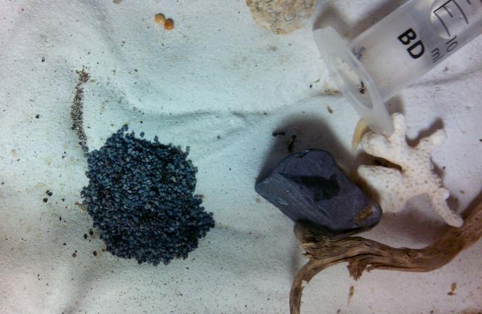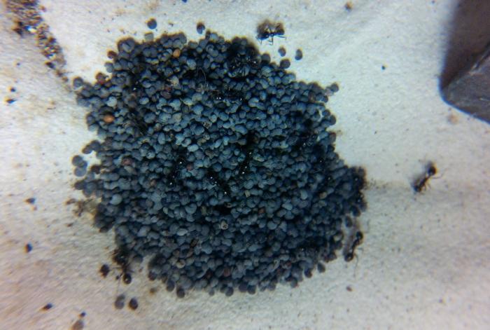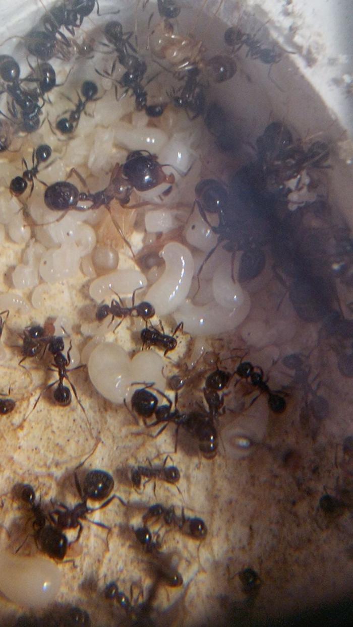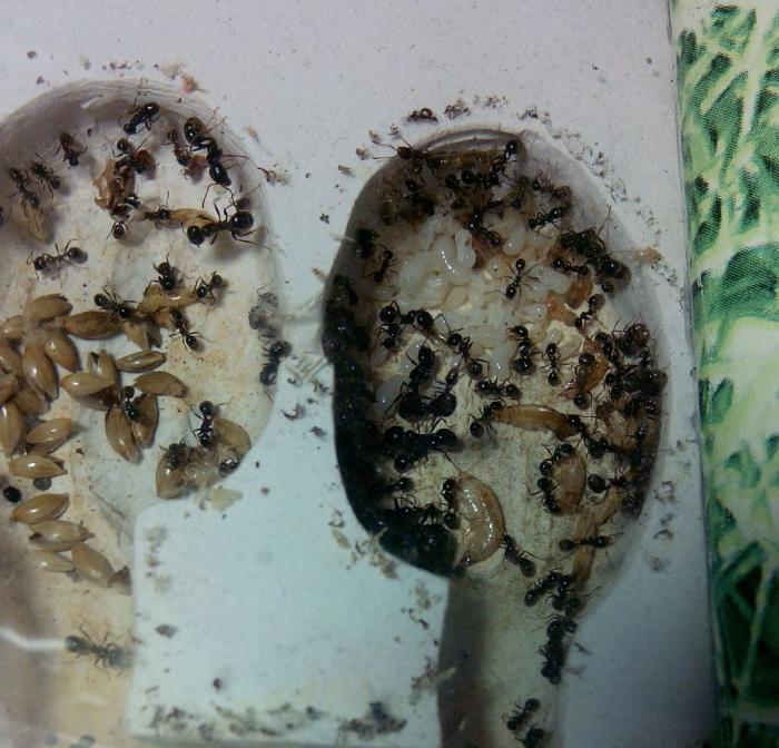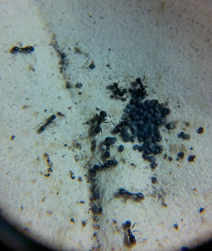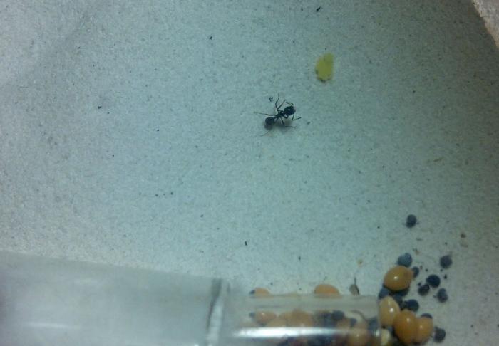 На 24.02.2014 численность колонии увеличилась на 1 мураша, но уже на подходе две куколки, до 10 крупных личинок, где-то 5 поменьше, позавчерашний пакет яиц, бодрые рабочие и не отходящая дальше маковой кучи Миранда. Предложенный желток был воспринят довольно сухо: маленькую часть утащили и съели, остальное оставили валяться. Фурор произвел сушенный гаммарус, гора которого была растаскана в считанные минуты и сама королева лично урвала кусок