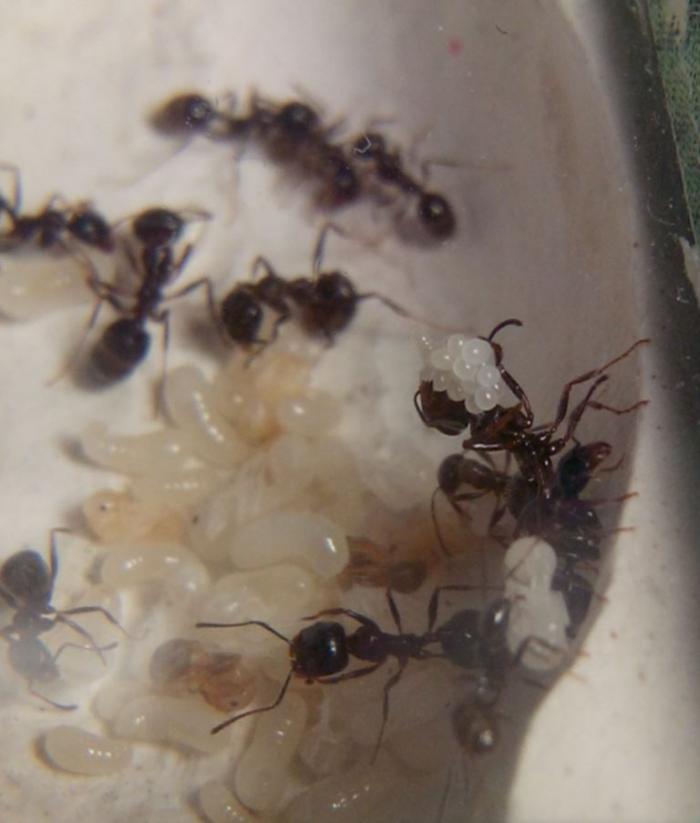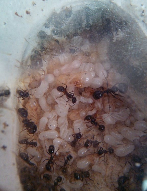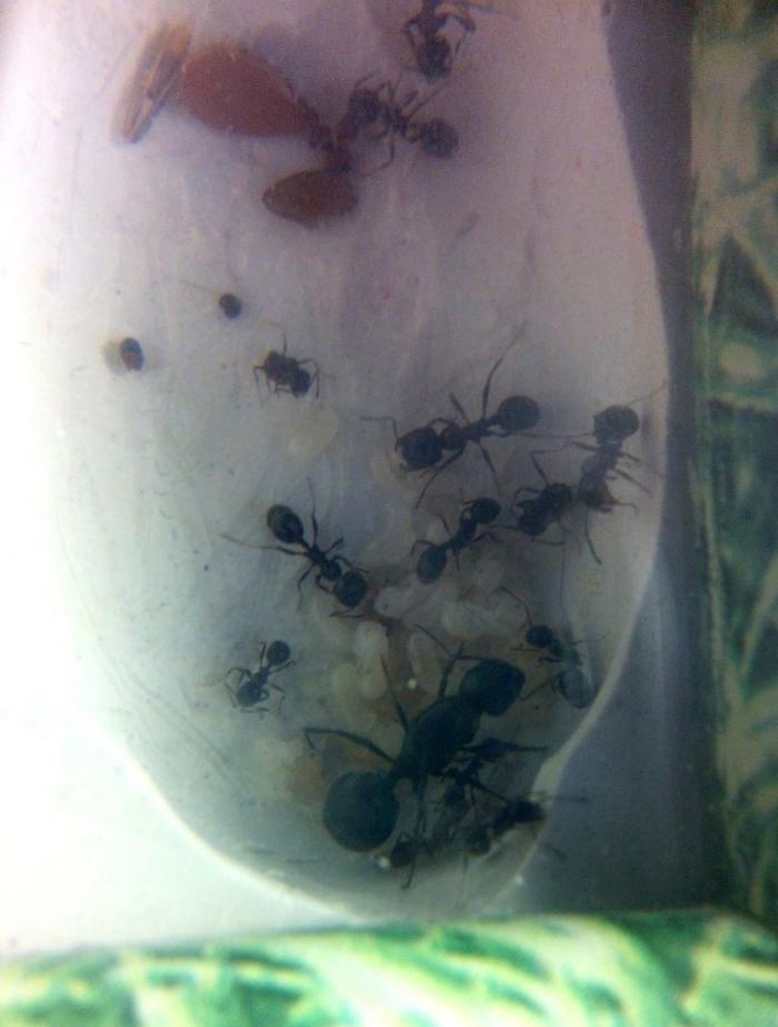 Хорошо, где-то неделю назад в этом месиве удалось разглядеть саму королеву, передающую няньке свежеотложенное яйцо. Возможно, причина такой пассивности во временном отсутствии белкового корма. Только вот колония уже как месяц сидит на мясной диете, а изменений особых нет, что несколько беспокоит.