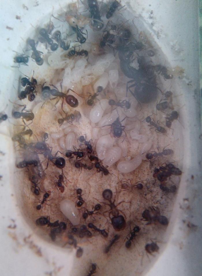 За прошедшие месяцы колония благополучно выросла в разы, без потерь пережив три недели вынужденного моего отсутствия. Предположительный размер семейства 120-150 особей. Точный подсчет сейчас провести, увы, невозможно: переборщила "чуток" с увлажнением на днях, и хоть мураши особого негодования не выразили (миграций в более сухие камеры не произошло), разобрать, что происходит там - невозможно. В любом случае, по окончанию сезона "тропических дождей" проведем в обязательном порядке перепись населения.