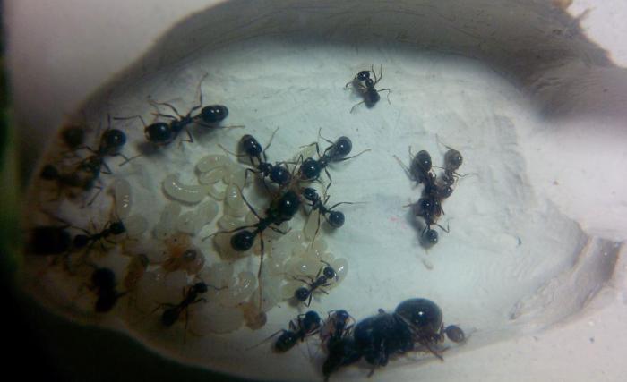 Многочасовая тряска в курьерской сумке и "жара" в -10 градусов скрутила королеву буквой "зю" и отломала брюшко (во всяком случае, я так думала, впервые в жизни видя в живую муравьиную матку). Однако, спустя сутки стали заметны её вялые перемещения, все еще нагоняющие страх. В первую неделю муравьиная семья уменьшилась где-то на 4-5 особей, думаю, их невероятно расстраивало положение в столице, и особо переживательные отправились в лучшие миры.