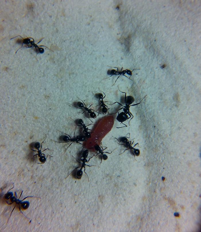 Смотря на происходящее вокруг, Миранда явно задепрессировала и сожрала почему-то пожелтевшую личинку (именно личинку) и это при регулярной подкормке курицей, которая по прежнему идет на ура. Сейчас уже третий день мураши забарикадировались маком и выползли лишь унести к себе подношение в виде пойманной на подоконнике мошки.