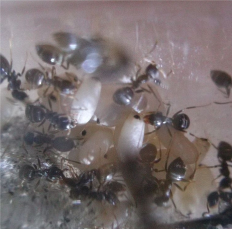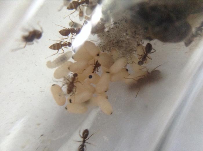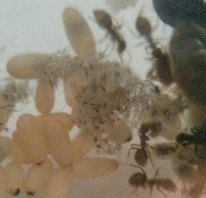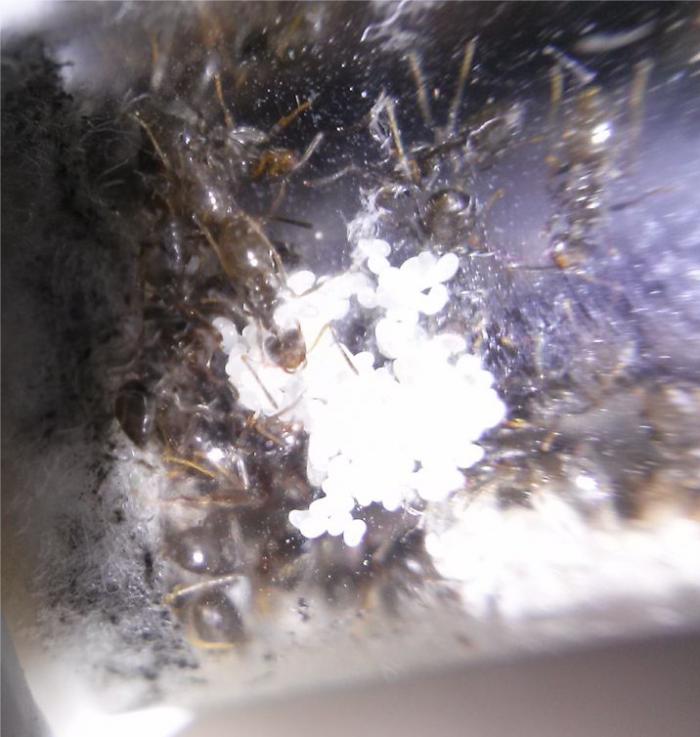 Есть несколько заметно более крупных муравьев - все следят за яйцами, которых куча и не уменьшается.