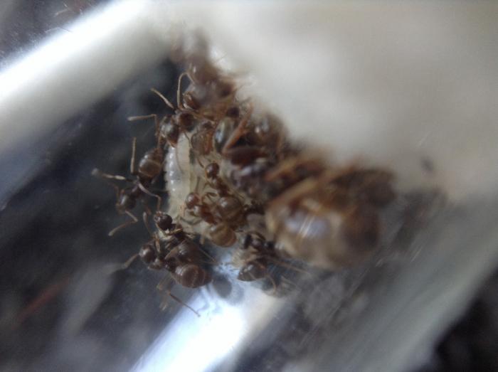 В пробирке уже 40 муравьев и около 30 больших куколок - похоже, пробирка переполняется.