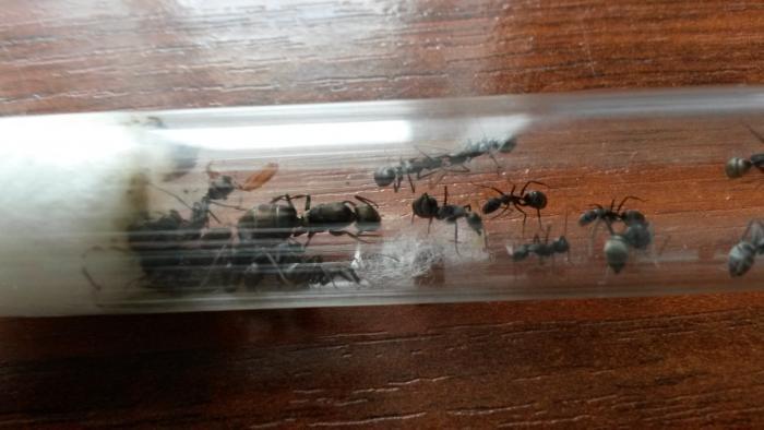 Муравьи недели две назад переселились в пробирку, их стало легче кормить и смотреть за ними .Появился большой пакет яйиц и начали появляться личинки. Кажется всё стало нормально.Тьфу-тьфу-тьфу.