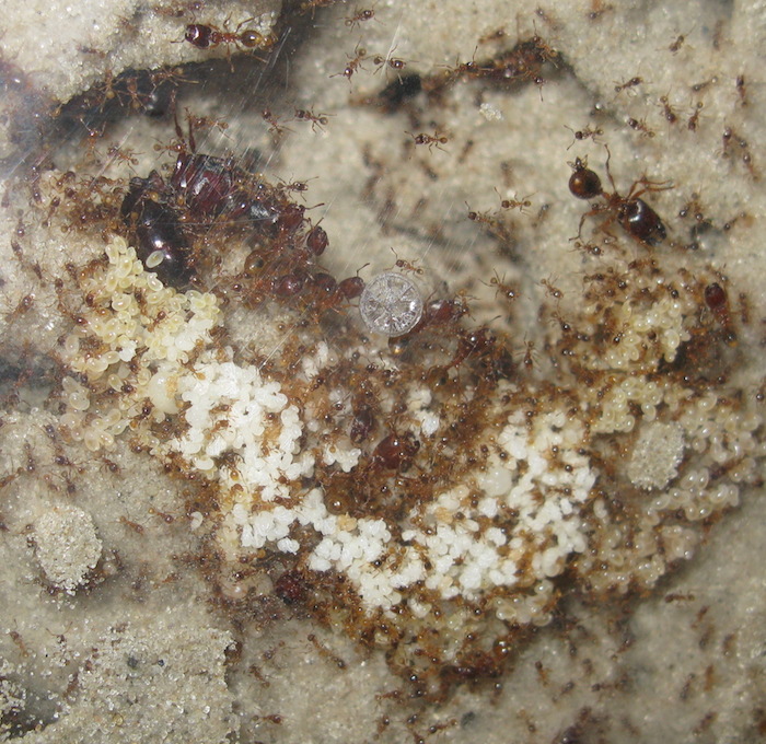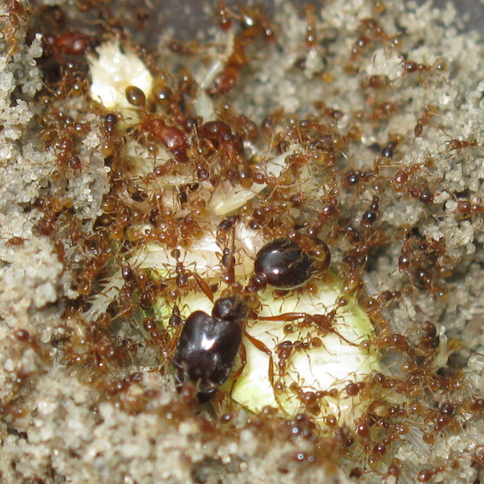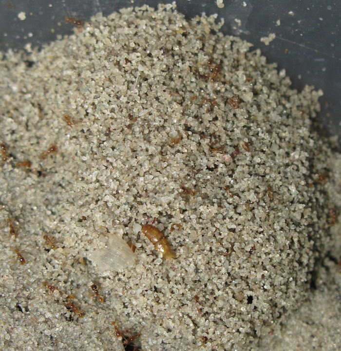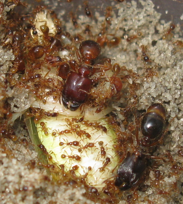 Пару свежих фоток меньшей колонии. У них меньше места, чем в большей, поэтому рабочие выращивают небольших солдат.