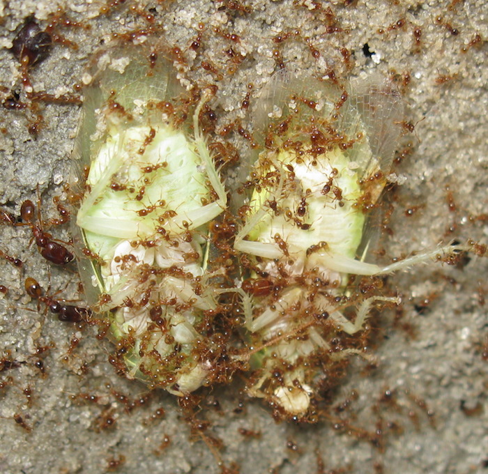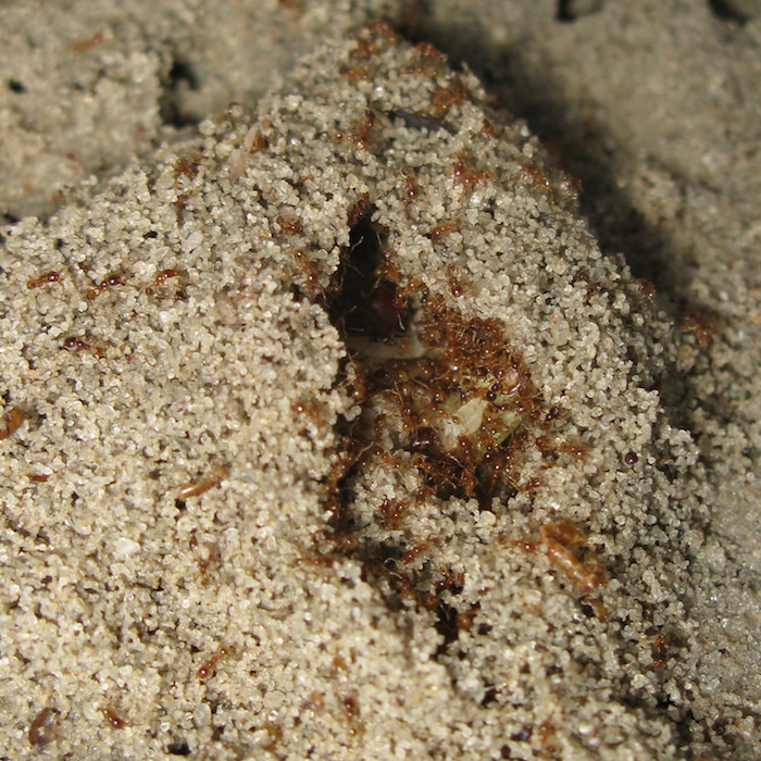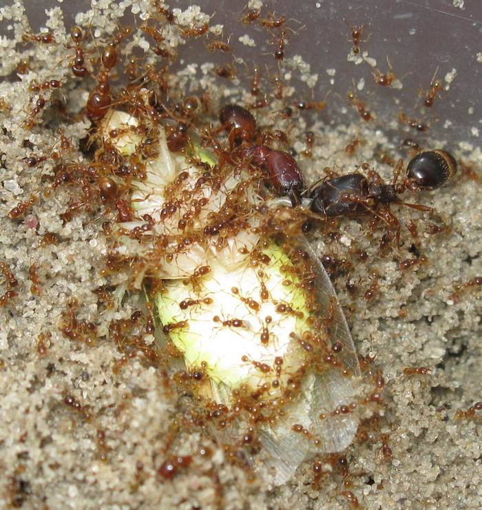 Интересно, кто из вменяемых муравьев сунется в толпу гетонов, чтобы отобрать у них добычу? :) Фото процесса закапывания таракана можно посмотреть в первом комментарии.