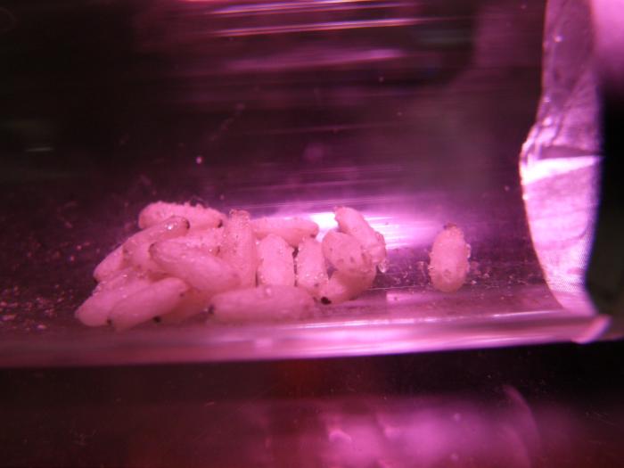 Посчитал коконы, подсвечивая инкубатор красным светом.Всего 8 штук.Кто знает, сколько времени проходит от кокона до имаго у бегунков?