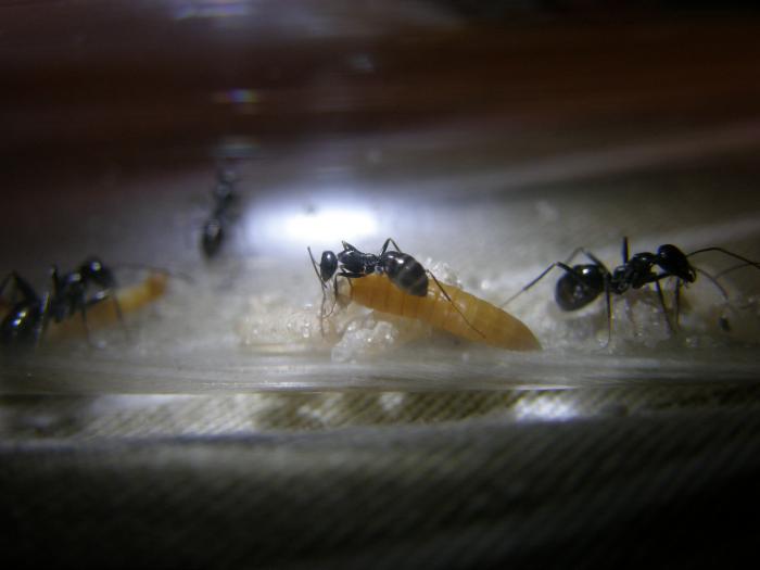 На арену стал выходить только один бегунок,который без устану роет песок,выбирая самые крупные песчинки и засыпает ими вход,поилку и кормушку.Остальные мураши не показывают носа даже в трубочке.Решил посмотреть чем же они заняты и заняты ли вообще,может опять жертвы!?Слава Богу,все живы!Как оказалось у них появились личинки, штук несколько,посчитать не успеваю уж очень быстро они реагируют на попадание света в инкубатор.Не мог даже представить,что несколько личинок могут вызвать у меня столько положительных эмоций ))))).Вроде бы ничего существенного не произошло,но на работу я пойду с хорошим настроением ))).