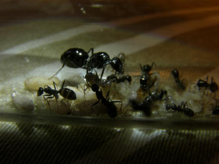 Один рабочий помер.Осталось всего девять.Пакет яиц вырос раза в три.Присоединил маленькую аренку с песком,которая раньше была у моих нигеров.Гуляют они по ней не очень охотно,как только на арене закончится еда и сироп убираются восвояси,оставляя охранника на выходе.Кормлю их личинкой знахаря,креветкой,гаммарусом,дафнией и сушённым мотылём,ну и медовый сироп конечно.Пробовал давать мак,как едят не видел но поилку забивают полностью.Качество фото как всегда((( Чем богаты тем и рады.