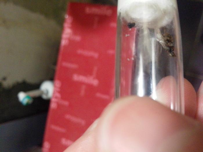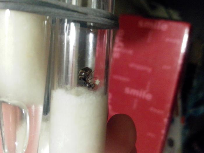 На этих выходных на даче случился лёт, ощущение, что сразу во всех муравейниках(их раньше даже видно не было). Я быстро схватил спичечный коробок, и отловил парочку в процессе оплодотворения(они падали периодически на землю сцепленные). Через пару часов, дома данную парочку усадил в инкубатор-пробирку. Очень хотел увидеть процесс отгрызания крыльев, а точнее техпроцесс, интересно как матка головой до "спины"(торакс) дотягивается. Вчера обнаружил матку и самца, носящихся по пробирке, а на стенках пробирки маленькие белые точки разбросаны, штук 5 предположительно яйца. Было удивительно, но матка все еще с нормальными крыльями. Сегодня мое удивление подкрепилось, матка наделала еще "точек" и собрала их в кучку, крылья на месте. Самец видимо при смерти.
