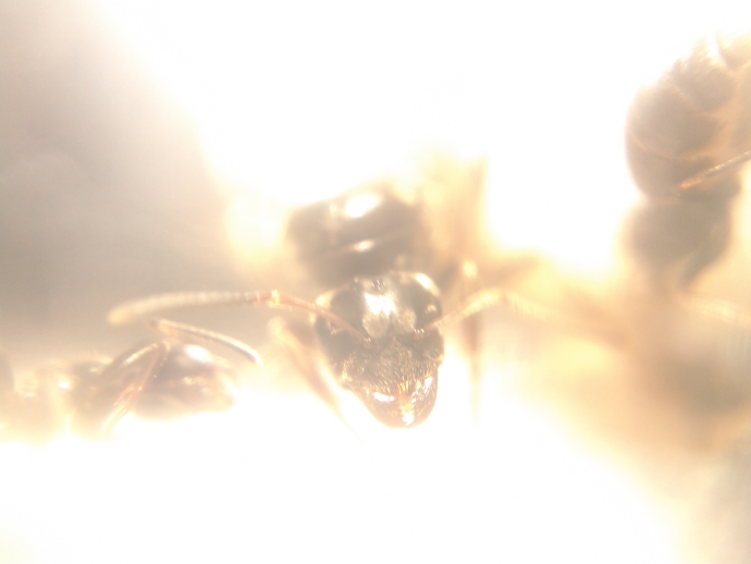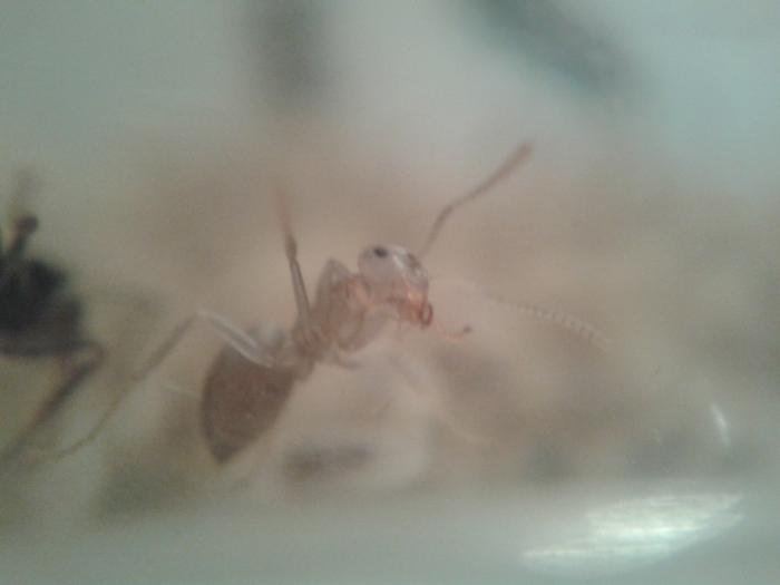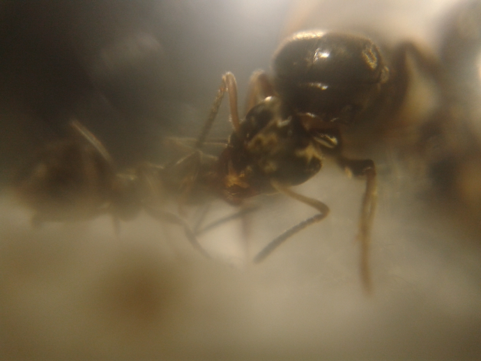 Надо отметить что первые 4 подкидыша в два раза крупнее появляющихся *родных* мурашей. Связан их размер с доставшимися обязанностями или нет - не знаю, но один выполняет роль разведчика-фуражира, двое мнят себя охранниками и сидят между расплодом и выходом сканируя пространство усиками. Последний из *черепашек-ниндзя* выполняет роль надзирателя за няньками и *вскрывальщиком* коконов. Личинок он не кормит, но активно контролирует работу остальных.