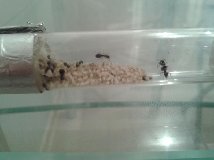 Немного покумекав приготовил новый инкубатор и соединил трубкой, мураши переселились за час. Еще пол часа они выдирали коконы из этой конструкции из ватки. Когда в пробирки осталось три мураша - помог им пинцетом, высыпал их на аренку - затащили внутрь.