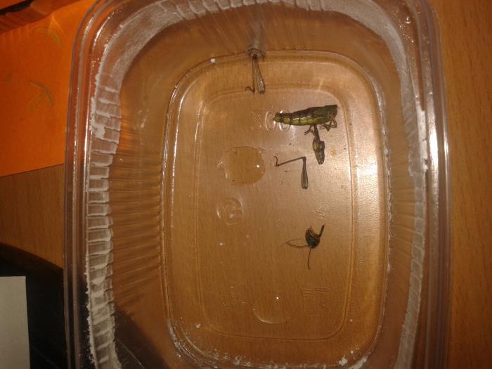 Так как подарок судьбы был нежданным - никакого оборудования на тот момент я дома не имел. До дома донес их в пластиковой бутылке, дома пересадил в пищевой контейнер. Поставил пробку с водой для увлажнения и в качестве поилки, проделал дырки в крышке для вентиляции.